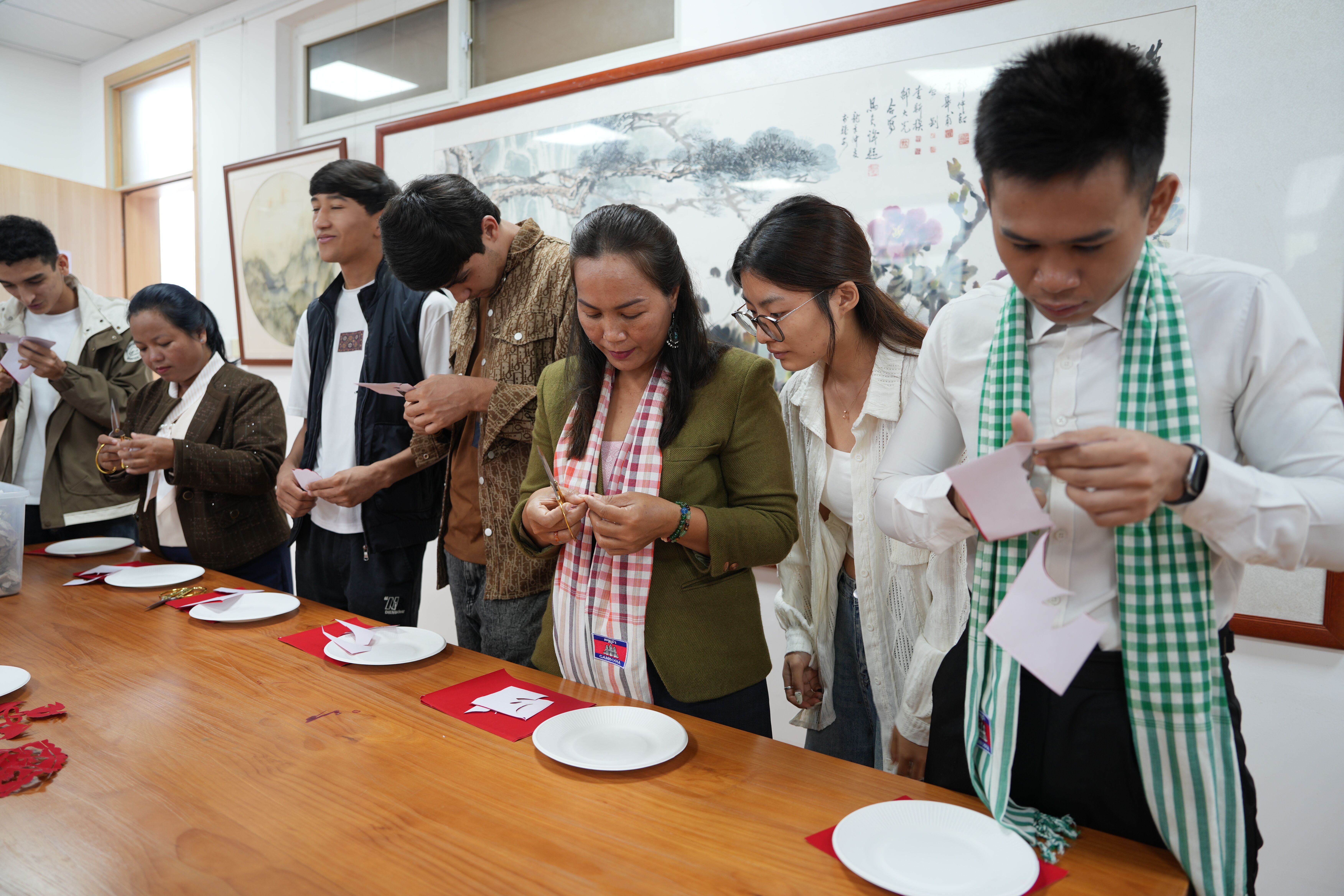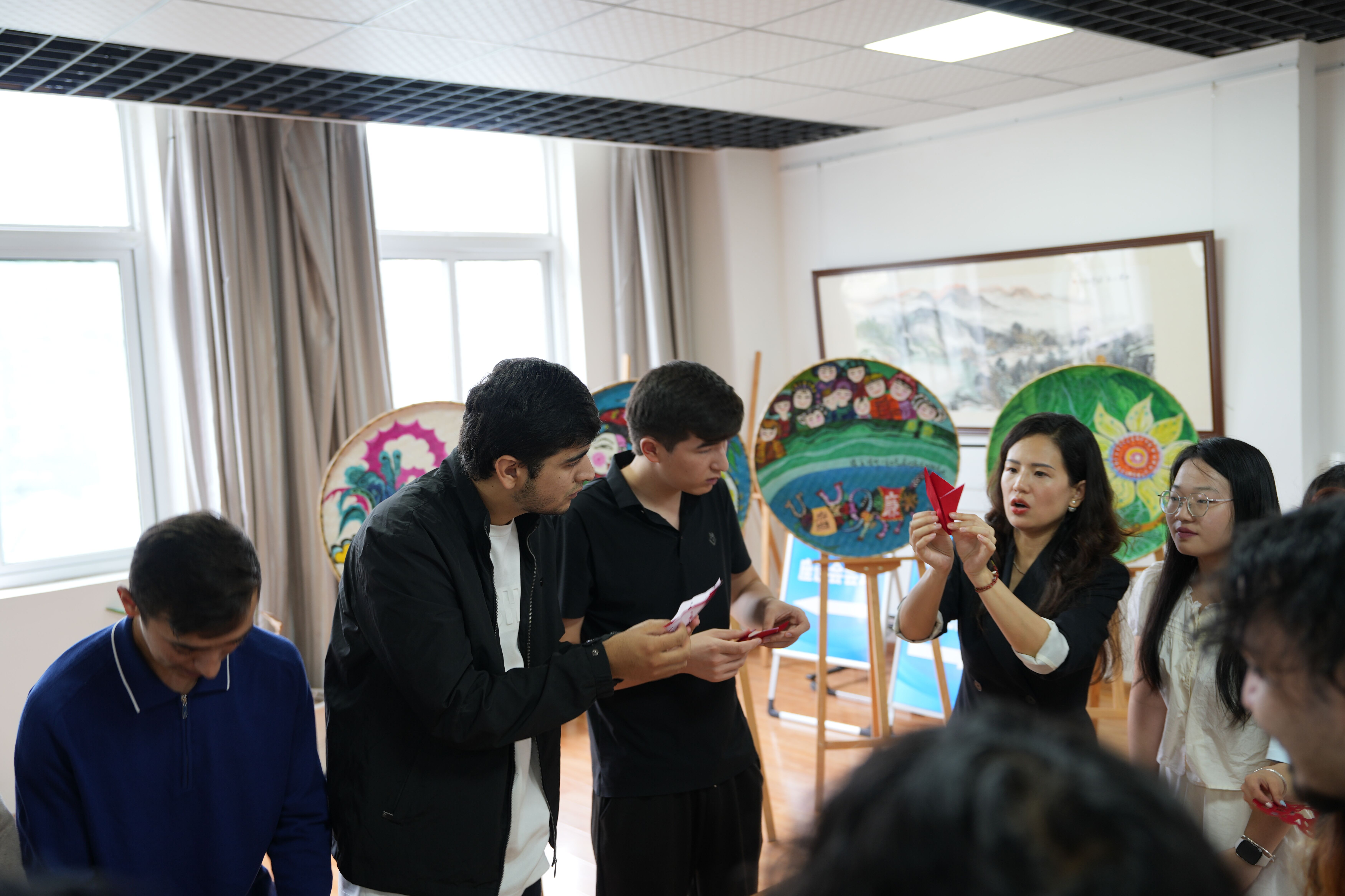 文化感知环节中,英语教师周婧悦以生动的语言讲述了中秋节的起源故事,从嫦娥奔月的古老传说到现代赏月、吃月饼的习俗,并逐一教授“月饼”“团圆”等基础中文词汇。留学生们边听边练边记,在语言学习中悄然触碰中华文化的细腻肌理。紧接着,经管学院志愿者的茶艺表演如一幅流动的东方画卷徐徐展开——沸水冲泡间茶香四溢,留学生们围坐品茗,在“以茶会友”的互动中感受着中国人“和而不同”的处世哲学。最后,师范学院志愿者的非遗剪纸体验将活动推向高潮,红纸在指尖翻飞,剪刀起落处,既有象征团圆的玉兔图案,也有寄托爱国情怀的“中国”剪影,传统技艺与异国创意在此刻交融,绽放出绚丽的跨文化火花。