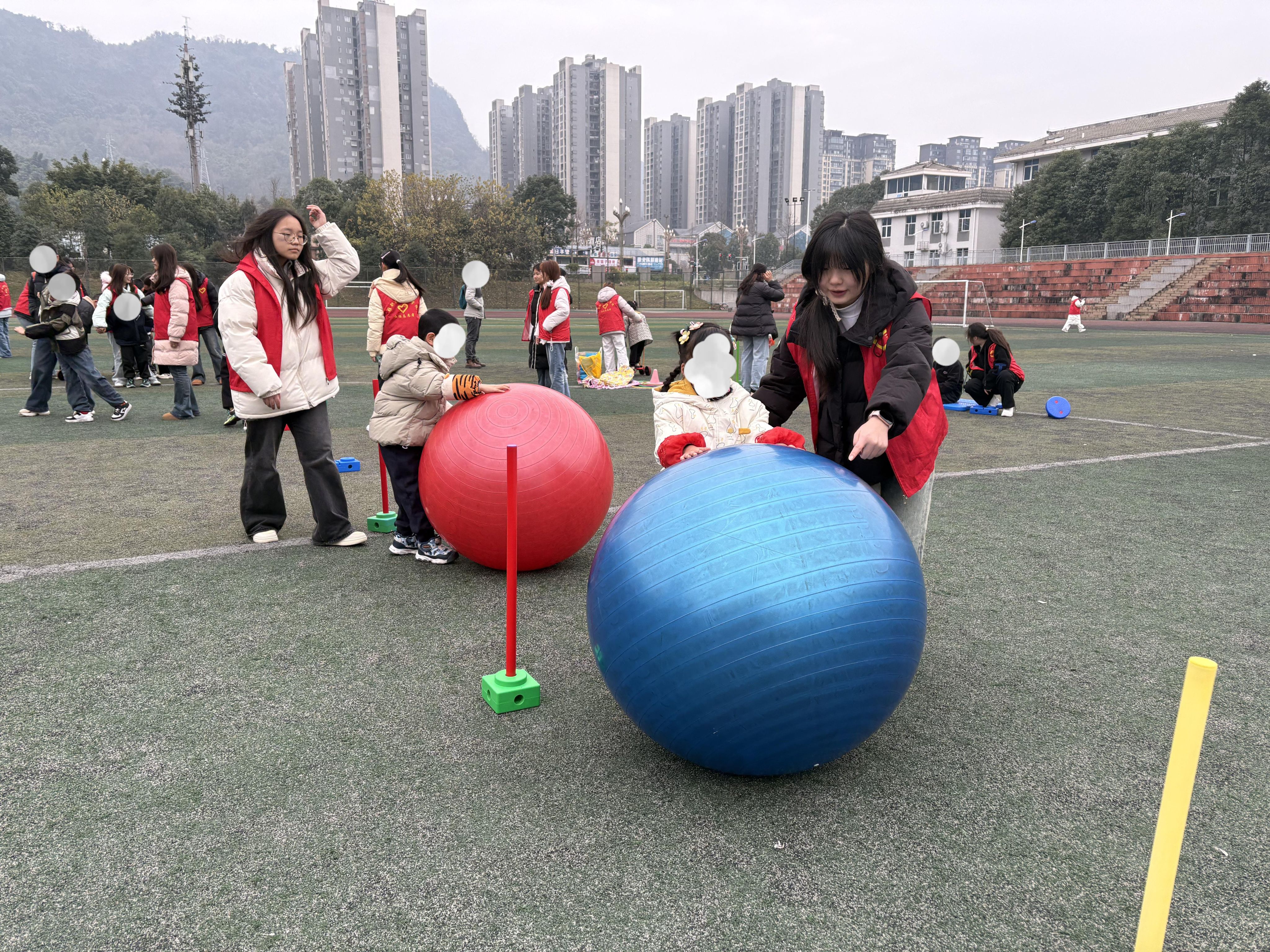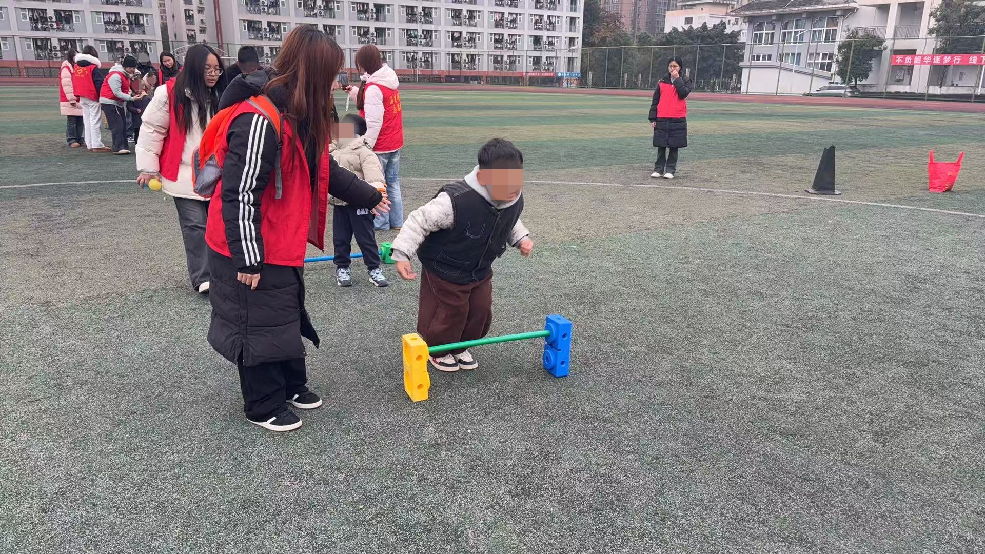 活动伊始,志愿者带领孩子们开展原地慢跑、关节拉伸等热身运动,充分激活身体机能,降低运动风险。随后,平衡踩踏车、跳袋运球、绕杆推大龙球等七大趣味项目依次开展,每个项目均设置两轮体验环节,让孩子们充分感受运动乐趣。活动全程,志愿者始终坚守在孩子们身边,全程做好安全防护,耐心引导、积极鼓励孩子们独立完成挑战,适时给予协助支持。运动间隙,志愿者带领孩子们开展放松律动活动,伴着欢快的儿歌旋律,孩子们跟随节奏摆动身体,现场欢声笑语不断,每一颗“特殊星光”都在关爱中绽放别样光彩。