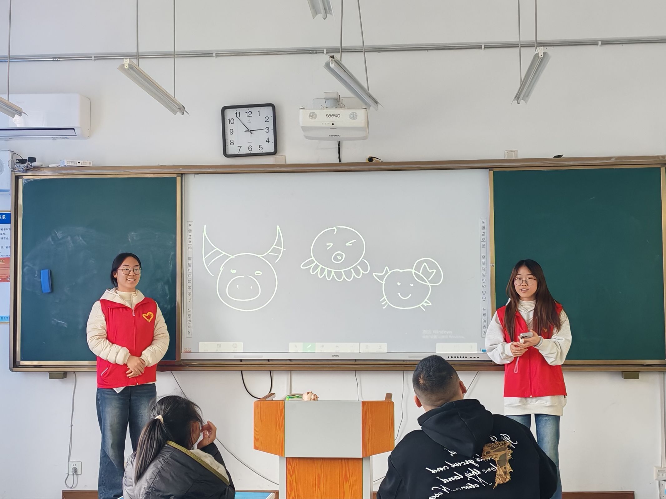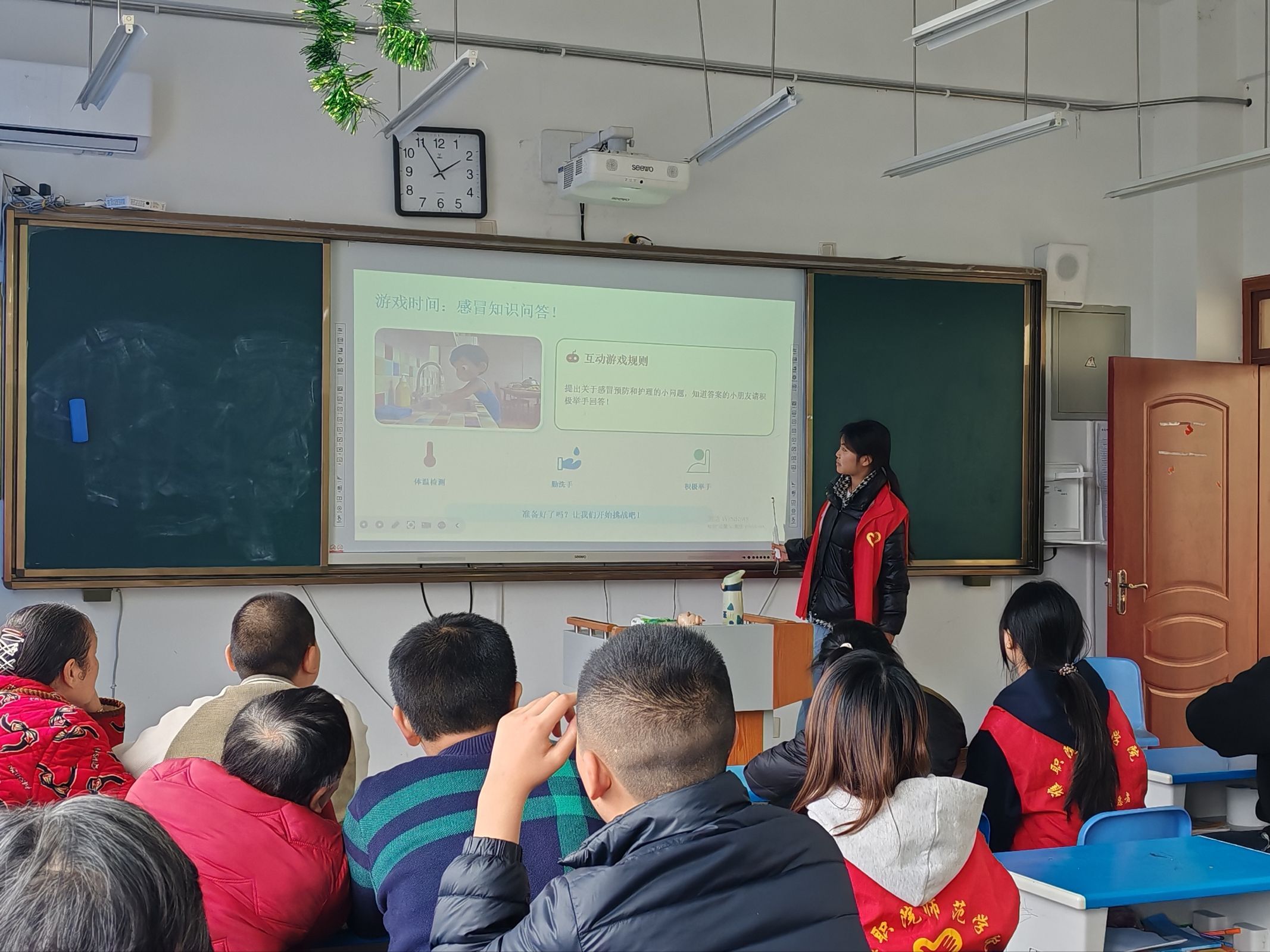 活动中,志愿者用通俗易懂的语言讲解春季防病和健康饮食知识,手把手教孩子们规范洗手,帮助他们养成良好的卫生习惯。同时,志愿者借助表情卡片、绘本故事,引导孩子们认识情绪、学习表达与调节。在趣味互动环节,“听指令做动作”“你画我猜”等游戏轮番进行,志愿者一对一陪伴引导,鼓励孩子们大胆参与,现场气氛热烈温馨。