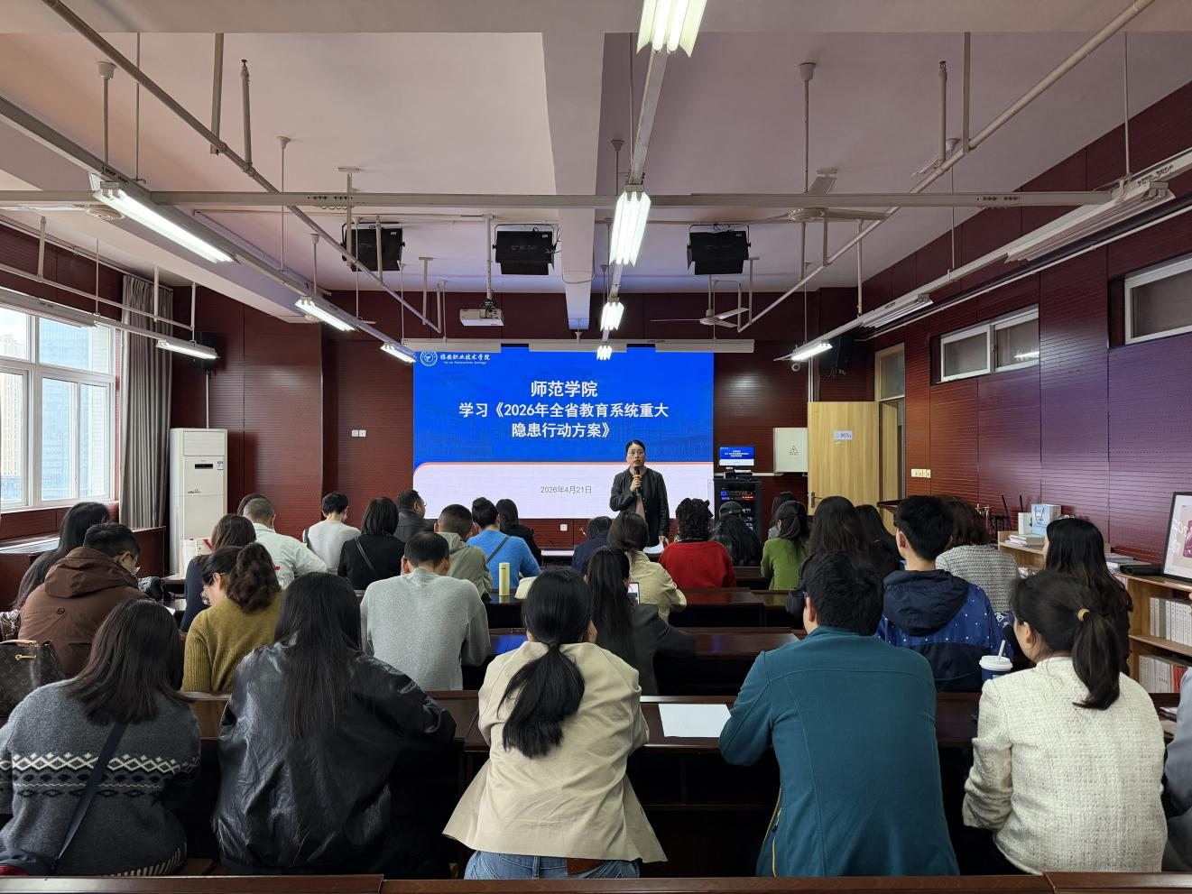 为深入贯彻落实四川省教育厅关于校园安全工作的最新部署,切实提升学院安全隐患排查治理能力,2026年4月21日,师范学院在青年校区图书楼903会议室召开全体教职工政治理论与业务学习会,专题学习《2026年全省教育系统重大安全隐患攻坚行动方案》和《四川省教育系统重大事故隐患判定指南》。师范学院院长冯良亮主持会议,全体教职工参加学习。